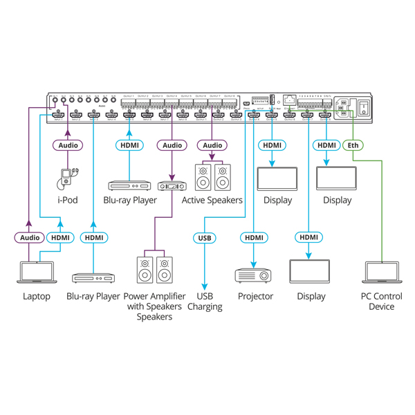 - Independent Audio Breakaway and Routing — The digital audio signals passing through to the selectable outputs, and ARC (Audio Return Channel) signals from the output–connected displays, are extracted, converted to analog audio signals, and input to the built–in audio matrix. Flexible matrix routing enables insertion of any audio input signal, either the breakaway input signals or from the matrix input ports, to any AV matrix output port or audio matrix analog balanced ports. This allows playing the audio on a locally connected professional audio system (such as DSP) and speakers, in parallel to playing it on the speakers connected to the AV acceptor devices (such as TVs with speakers).