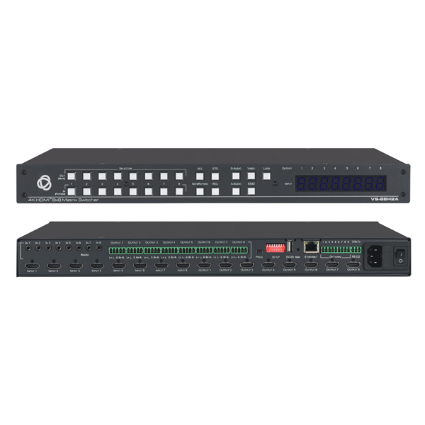 The Kramer VS−88H2A is a high−quality matrix with eight HDMI inputs independently routable to eight HDMI outputs. Integrated audio matrix, with matrix eight audio input and eight audio output ports, enable independent and flexible audio and ARC extraction, insertion and routing between any HDMI and audio ports.