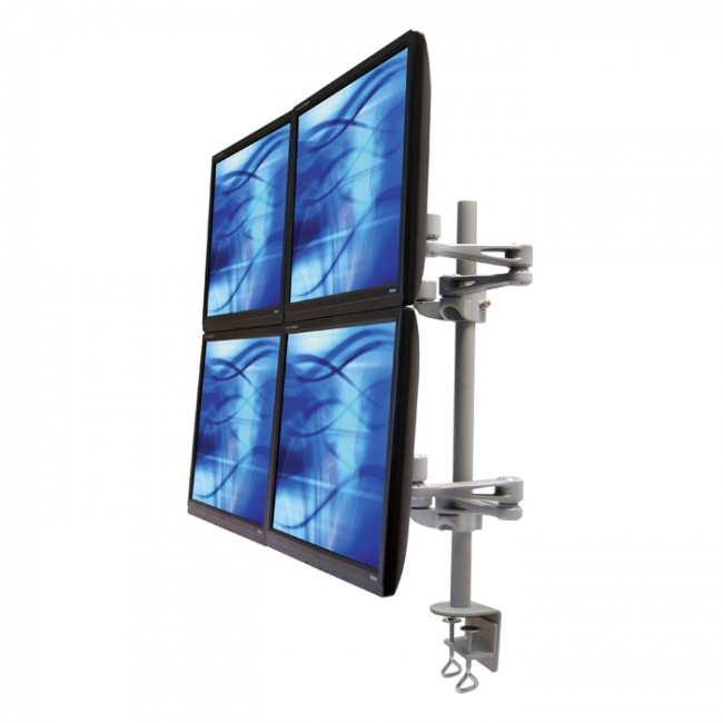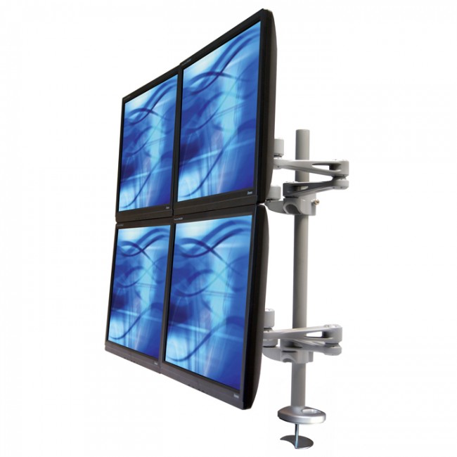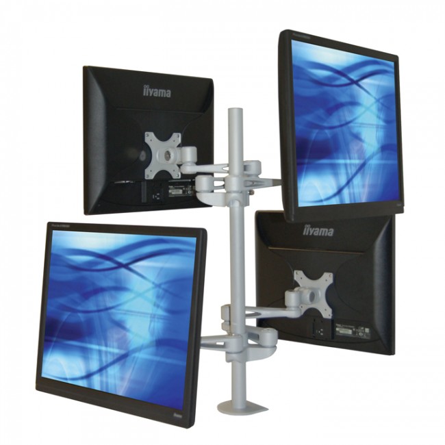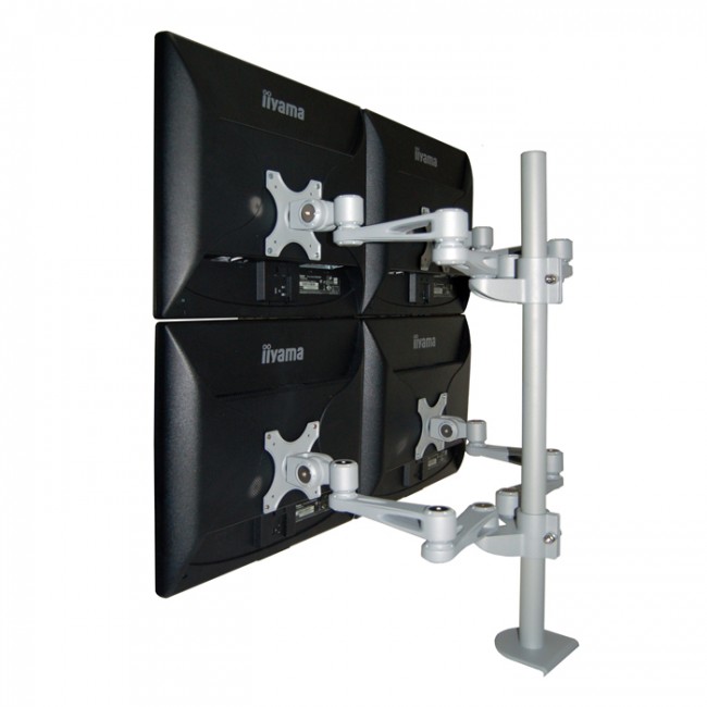 The ErgoMounts UltraView 440 Quad Monitor Desk Mount Arm is an ideal solution for those looking to mount four screens (up to 12Kg each) in a 2 above 2 below configuration. Each monitor can be individually adjusted to create your ideal setup. The UltraView 440 is designed around a 35mm diameter x 700mm tall pole to ensure the smallest possible footprint on the desk. The robust and ergonomic design allows for between 70mm and 470mm of monitor arm reach. Each monitor can tilt +/-90° and swivel +/-90°. Screens can also be rotated through landscape to portrait allowing faster reading and data entry. Maximum individual monitor width is 600mm. For larger screens contact our sales team for more information.
